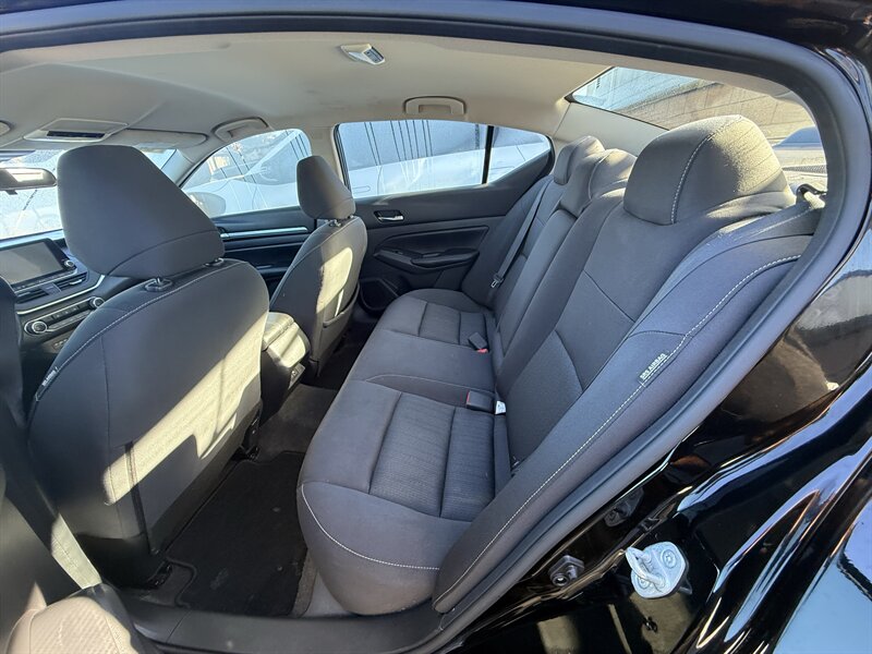2022 Nissan Altima 2.5 SV in Super Black with a Light Gray interior. Powered by a 2.5L I4 (188 hp, 180 lb-ft) paired with a CVT, it returns about 27 MPG city and 37 MPG highway and is in excellent overall condition. Factory equipment includes the Nissan Safety Shield 360 driver-assist suite (automatic emergency braking with pedestrian detection, blind-spot warning, rear cross-traffic alert, lane-departure warning), 8-inch touchscreen with Apple CarPlay and Android Auto, Bluetooth and USB connectivity, SiriusXM-capable audio, remote keyless entry with push-button and remote start, power-adjustable driver’s seat, automatic climate control, 17-inch alloy wheels, LED daytime running lights, rearview camera, and steering-wheel audio and cruise controls.