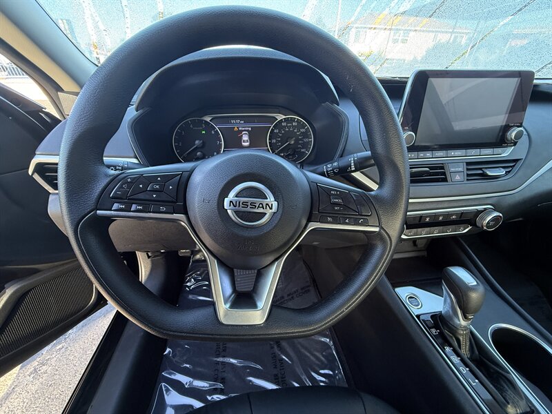 2022 Nissan Altima 2.5 SV en Super Black con interior Light Gray. Motorizado con un 2.5L I4 (188 hp, 180 lb-ft) acoplado a una transmisión CVT, ofrece aproximadamente 27 MPG en ciudad y 37 MPG en carretera; está en excelente condición general. El equipo de fábrica incluye el sistema de asistencia Nissan Safety Shield 360 (frenado automático de emergencia con detección de peatones, aviso de punto ciego, alerta de tráfico cruzado trasero y advertencia de salida de carril), pantalla táctil de 8 pulgadas con Apple CarPlay y Android Auto, conectividad Bluetooth y puertos USB, audio compatible con SiriusXM, entrada sin llave con botón de arranque y arranque remoto, asiento del conductor con ajuste eléctrico, control automático de climatización, rines de aleación de 17 pulgadas, luces diurnas LED, cámara de visión trasera y controles de audio y control de crucero en el volante.
